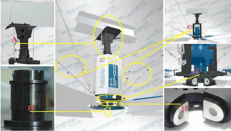 E、電機法蘭盤的“T”型雙孔軸內(nèi)嵌入兩個防轉(zhuǎn)動隔振橡膠套,吸收吊扇運轉(zhuǎn)時產(chǎn)生的振動,防止在橡膠老化時葉片過度上翹或下垂;