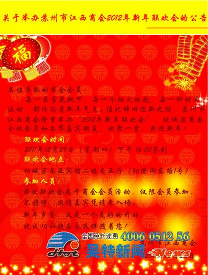 本公司消息:2011年12月30號,昨天公司黃總應(yīng)邀參加蘇州江西商會2012年新年聯(lián)歡會。作為蘇州江西商會的一員,也是蘇州市蘇州江西商會誠信會員。