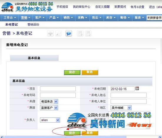 本公司消息:2012年2月16日,為了把本公司的的貨架銷售和售后服務(wù)做到盡善盡美,故公司在內(nèi)部系統(tǒng)crm里面特別添加了來電登記板塊。使每一位客戶所咨詢反映的問題都能夠第一時(shí)間反饋給技術(shù)人員。