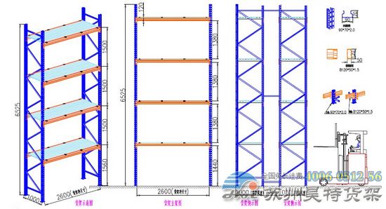 (1)貨架示意圖:貨架的總長(zhǎng)度為:2600mm(貨架凈尺寸);高度為:6525mm ;深度為:1000mm;一層層高為:1560mm,二層層高為:1500mm,三層層高為:1500mm,四層層高為:1500mm,高于安全距為:465mm