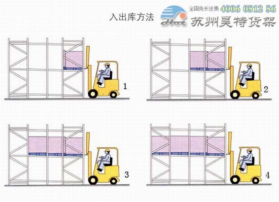 儲運貨物時叉車只位于貨架通道水平較低的一端作業(yè),無需進入貨架貨物存儲通道。此類貨架具有存儲密度高,儲運速度快的典型特征。