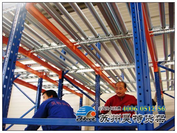 橫梁上安上滾筒式軌道,軌道呈3-5°傾斜。托盤貨物用叉車搬運(yùn)至貨架進(jìn)貨口,利用自 重,托盤從進(jìn)貨口自