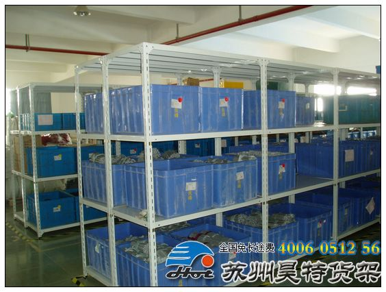 ,貨架每層的載重量較輕。一般,該貨架的立柱采用薄鋼板(δ=1—2.5mm)冷彎沖孔而成,其截面呈三角形,故又稱“帶孔角鋼貨架”。為提高載重量,也有截面呈開口方形。貨架構(gòu)件間的連接有螺栓連接和插接兩種。其特點是結(jié)構(gòu)簡潔、自重輕、裝配方便,廣泛應用于工廠企業(yè)、商店、辦公室、廚房等。