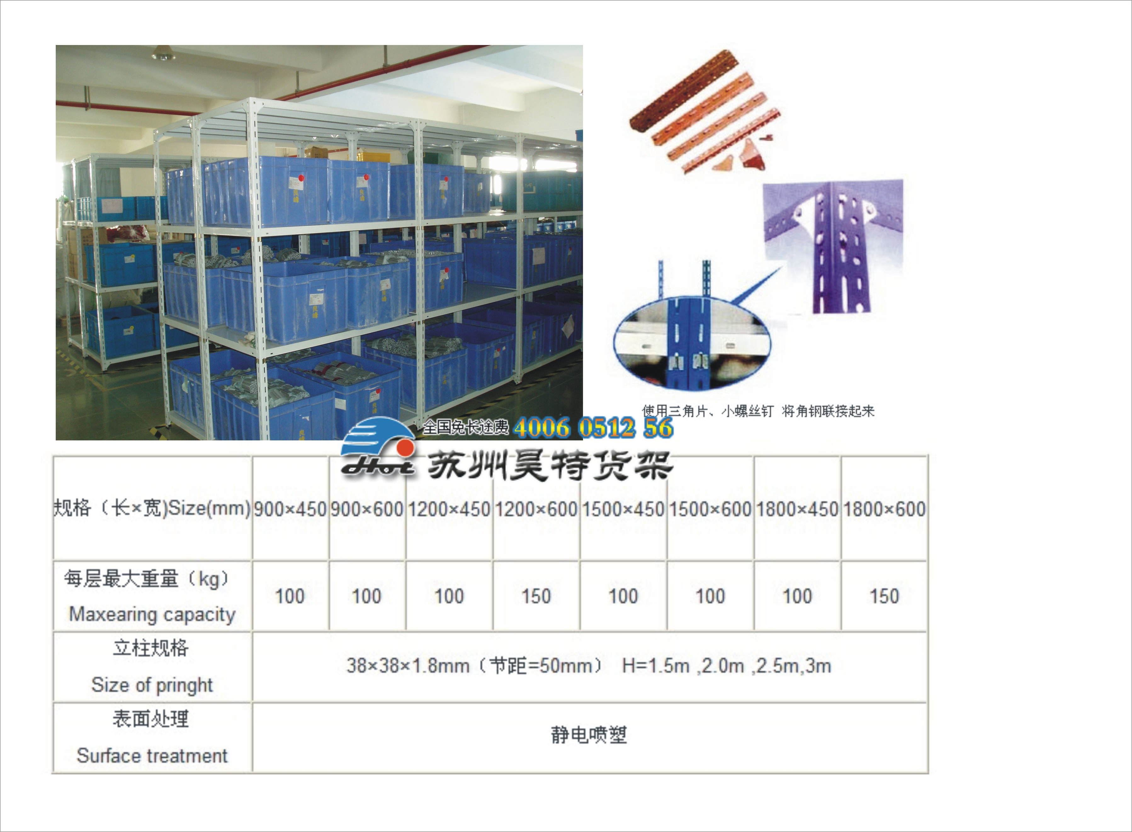 可任意自由組合,剛層板上下任意調(diào)節(jié),主要由立柱,鋼層板組成適用于人工存取較輕貨物,可與塑料周轉(zhuǎn)箱配合存放多品種小件產(chǎn)品,廣泛應(yīng)用于電子行業(yè)及小型零件倉庫,輕型貨架可以通過改變噴塑粉末或者鋪設(shè)特殊橡膠板實現(xiàn)防靜電功能,具體成本低,安全可靠,組裝,拆卸簡單的特點,可電鍍適用,也也可自由拼接成各種排列方式。角鋼貨架在地膠處增加萬項輪結(jié)構(gòu)甚至以實現(xiàn)轉(zhuǎn)運功能。