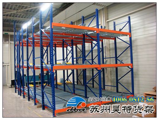重力式貨架又叫輥道式貨架,屬于倉儲貨架中的托盤類存儲貨架。重力式貨架是橫梁式貨架衍生品之一,貨架結(jié)構(gòu)與橫梁式貨架相似,只是在橫梁上安上滾筒式軌道,軌道呈3-5°傾斜。托盤貨物用叉車搬運至貨架進貨口,利用自重,托盤從進口自動滑行至另一端的取貨口。重力式貨架屬于先進先出的存儲方式。重力式貨架深度及層數(shù)可按需要而定。重力式貨架適用于少品種大批量同類貨物的存儲,空間利用率極高。