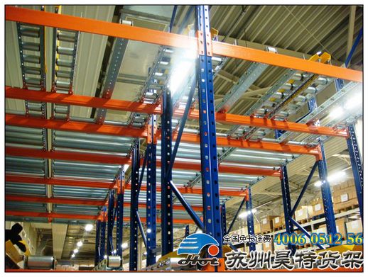 重力式貨架又叫輥道式貨架,屬于倉(cāng)儲(chǔ)貨架中的托盤(pán)類存儲(chǔ)貨架。重力式貨架是橫梁式貨架衍生品之一,貨架結(jié)構(gòu)與橫梁式貨架相似,只是在橫梁上安上滾筒式軌道,軌道呈3-5°傾斜。托盤(pán)貨物用叉車搬運(yùn)至貨架進(jìn)貨口,利用自重,托盤(pán)從進(jìn)口自動(dòng)滑行至另一端的取貨口。重力式貨架屬于先進(jìn)先出的存儲(chǔ)方式。重力式貨架深度及層數(shù)可按需要而定。重力式貨架適用于少品種大批量同類貨物的存儲(chǔ),空間利用率極高。