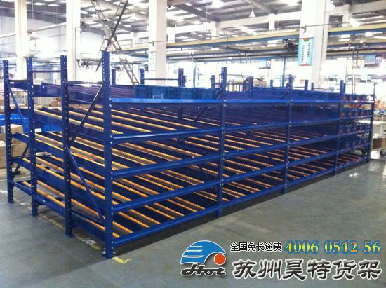 流利式貨架特點:流利條貨架是將貨物置于滾輪上,利用一邊通道存貨,另一邊通道取貨。料架朝出貨方向向下傾斜,貨物在重力作用下向下滑動?蓪崿F(xiàn)先進先出,并可實現(xiàn)一次補貨,多次揀貨。流利架存儲效率高。適合大量貨物的短期存放和揀選,空間利用率達50%。