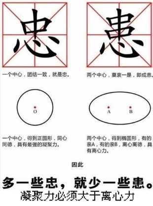 一個(gè)人可以負(fù)責(zé)幾件事,但一件事只能一個(gè)人負(fù)責(zé)。多人負(fù)責(zé)就會(huì)造成權(quán)力斗爭(zhēng)和推諉;部門如此,企業(yè)如此,社會(huì)也如此。啟發(fā):漢字一個(gè)中心則為“忠”,兩個(gè)中心則為“患”,老祖宗造字時(shí)就幫我們想清楚了。