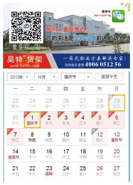 為了響應(yīng)國家號召,慶祝第64周國慶節(jié),昊特蘇州貨架公司關(guān)于國慶假期放假通知,做出以下安排:2013年10月1日至10月7日放假,共7天。10月1日至7日放假調(diào)休,共7天。9月29日(星期日)、10月12日(星期六)上班。節(jié)假日期間,給新老朋友帶來不便還請諒解,如有問題可咨詢服務(wù)電話:4006-0512-56~感謝您的支持!