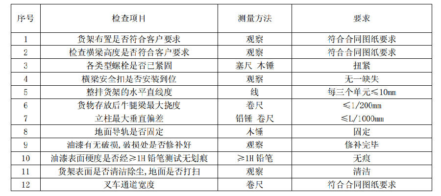目前,貨架市場種類層出不窮,從最初的輕型貨架發(fā)展到重型貨架,再從重型貨架發(fā)展到穿梭車貨架,而不同的貨架廠商也都有自己獨(dú)到的生產(chǎn)方法,但是不管生產(chǎn)如何不同,但是驗(yàn)收規(guī)范和標(biāo)準(zhǔn)卻是萬變不離其中。作為貨架采購人員或使用人員,都可以按以下的方法進(jìn)行驗(yàn)收。