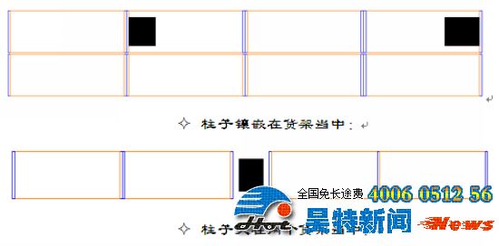 這種方案相對而言是最理想的,柱子既沒有在通道當(dāng)中,阻礙工作人員存取貨物;也沒有在倉儲貨架當(dāng)中,減少存儲量,但是此種方案有個(gè)最大的不足,它會浪費(fèi)一定量的倉庫空間,產(chǎn)品存儲量會減小,倉庫的利用率會降低。