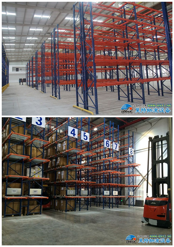 窄巷道貨架的巷道寬度要比普通橫梁式貨架的寬度小很多,一般在1600-2000mm左右;