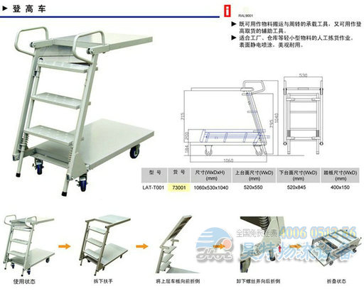 登高車的一面設(shè)有臺階(臺階旁邊有扶手)供使用者登上平臺,平臺另三面配有護(hù)欄保證作業(yè)者的安全。平臺作業(yè)面一般大小可容納1-2人站立、轉(zhuǎn)身、移動。使用者可在登高車的平臺上完成從貨架等高處堆取物品等動作。另外,登高車配有腳輪,可供使用者推拉轉(zhuǎn)向移動,方便快捷。其中有前腳輪上配備有輪剎,剎住后,登高車固定不可移動,使用者可安全放心的登高操作。